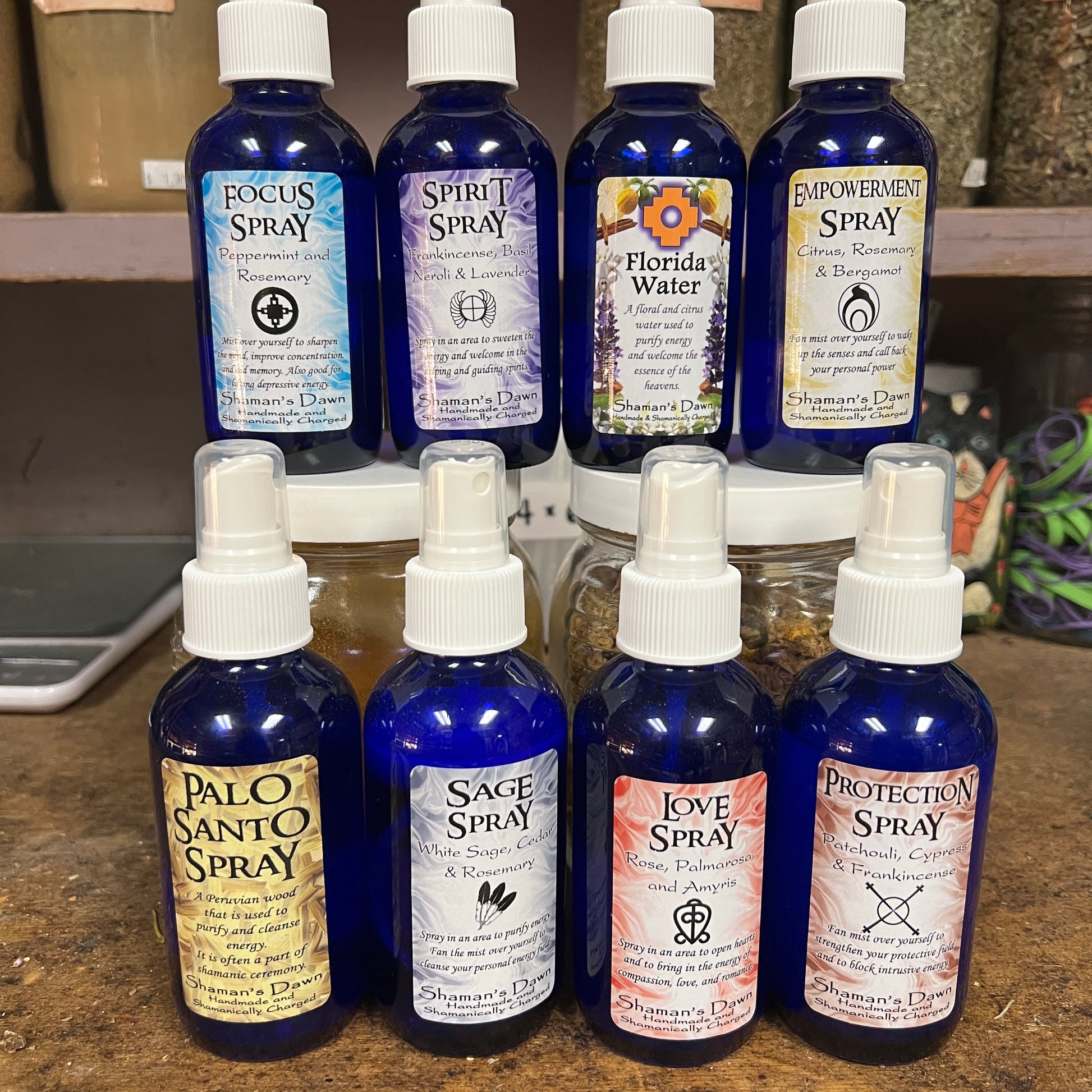 Hand Made - No Animal Products - No Animal Testing All Natural and Made with Essential Oils Shamanically blessed in ceremony The Shamans Dawn line of energy clearing sprays is hand blended and shamanically blessed by Adam Kane with healing energy and intention. Each spray is a blend of herbs that Adam was guided to use by the healing spirits. The sprays draw upon the powers and energies of the plant spirits within them to clear and balance the energy of a space or person's energy field to facilitate peace and healing. Each cobalt glass bottle is 4oz